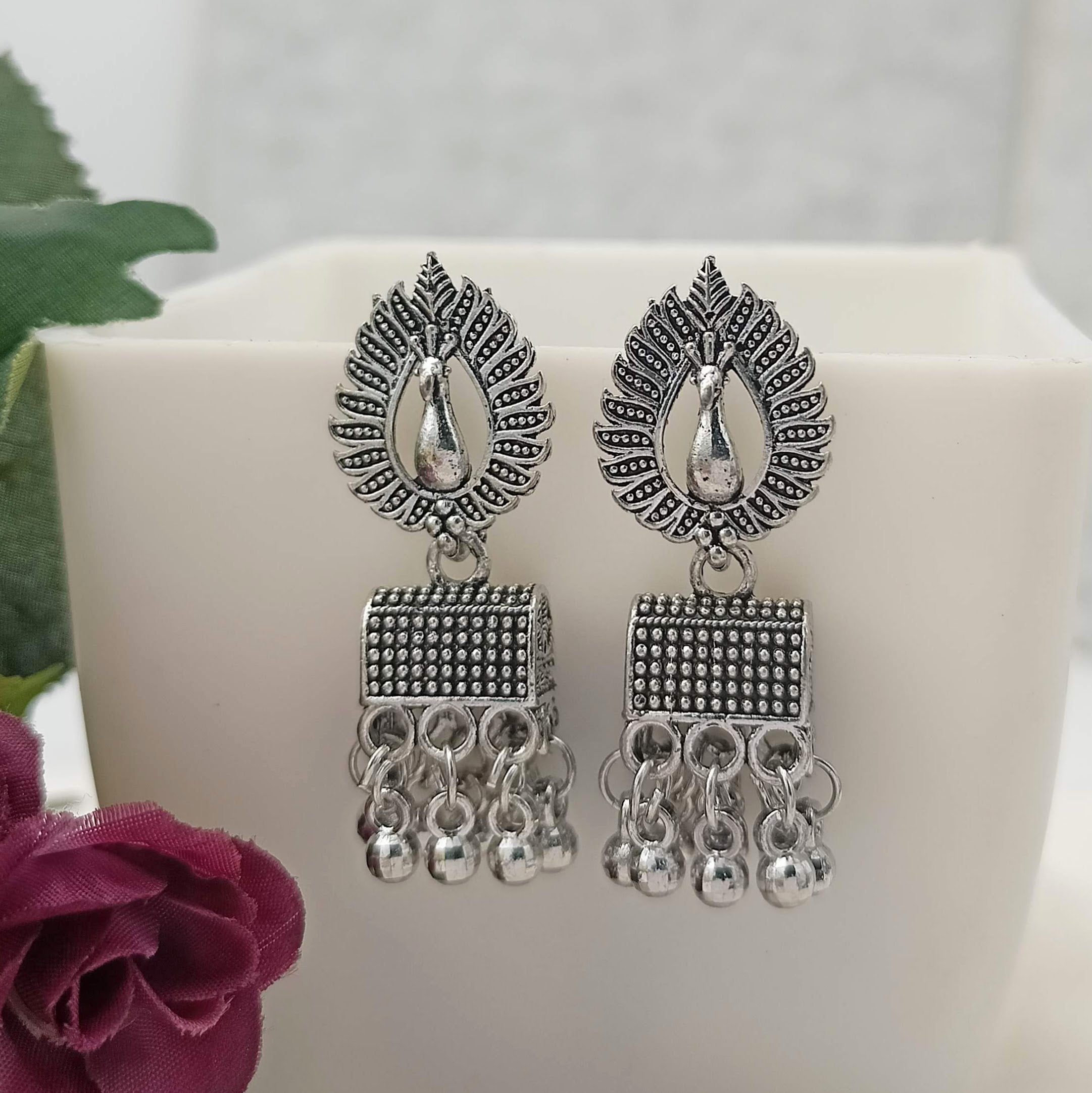 Doli Jhumka Peacock Stud Silver Oxidised Earrings