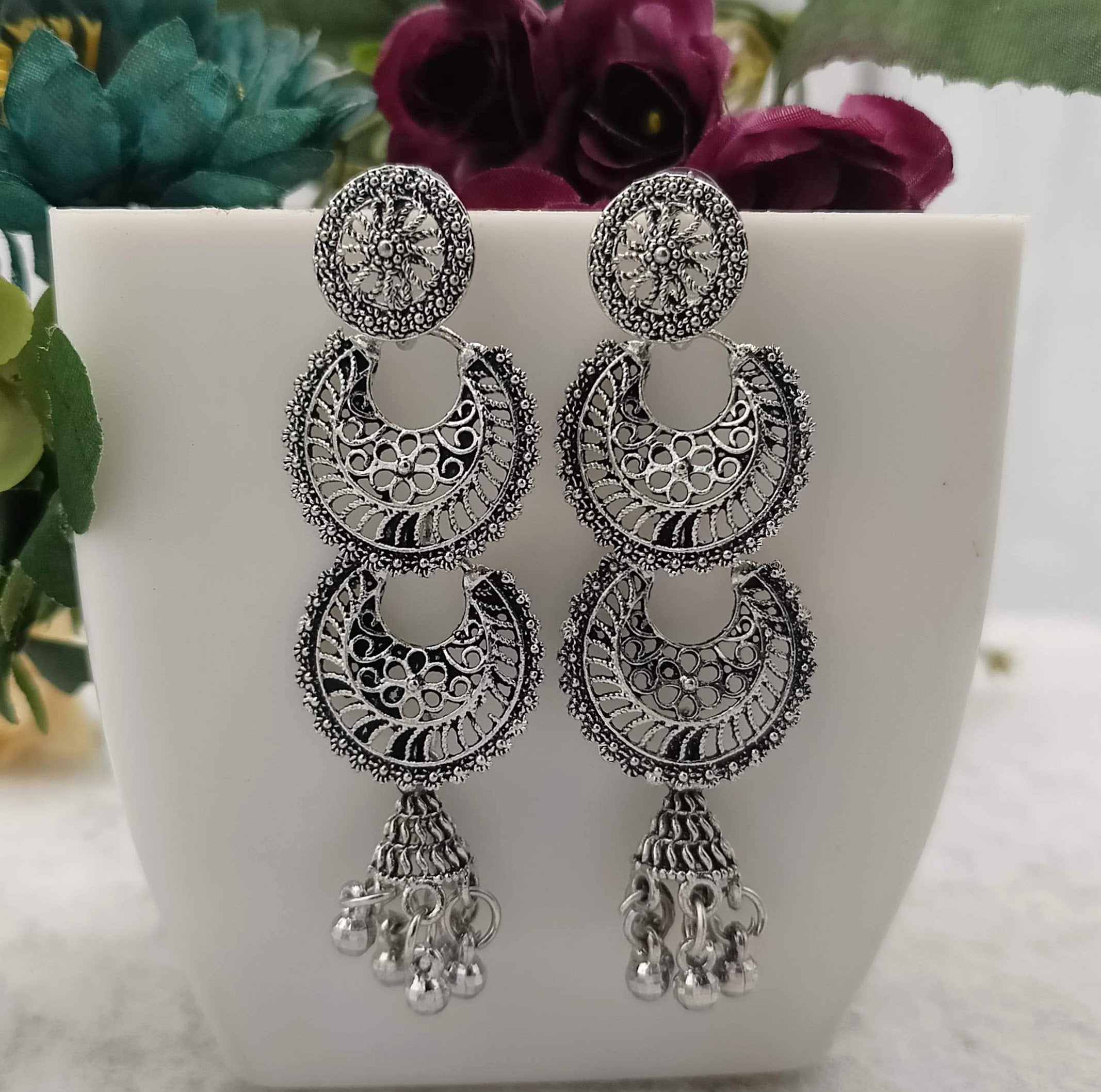 Double Chandbali Jhumka Silver Oxidised Trending Earrings