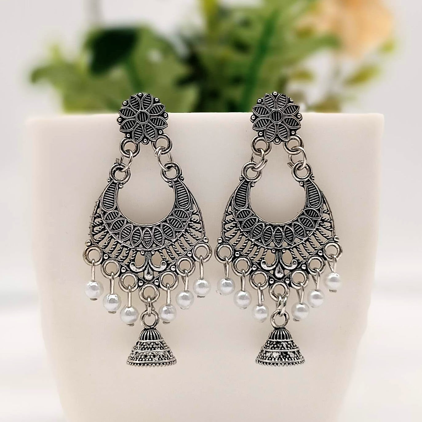 Drop White Beads & Jhumka Silver Classic Oxidised Earrings