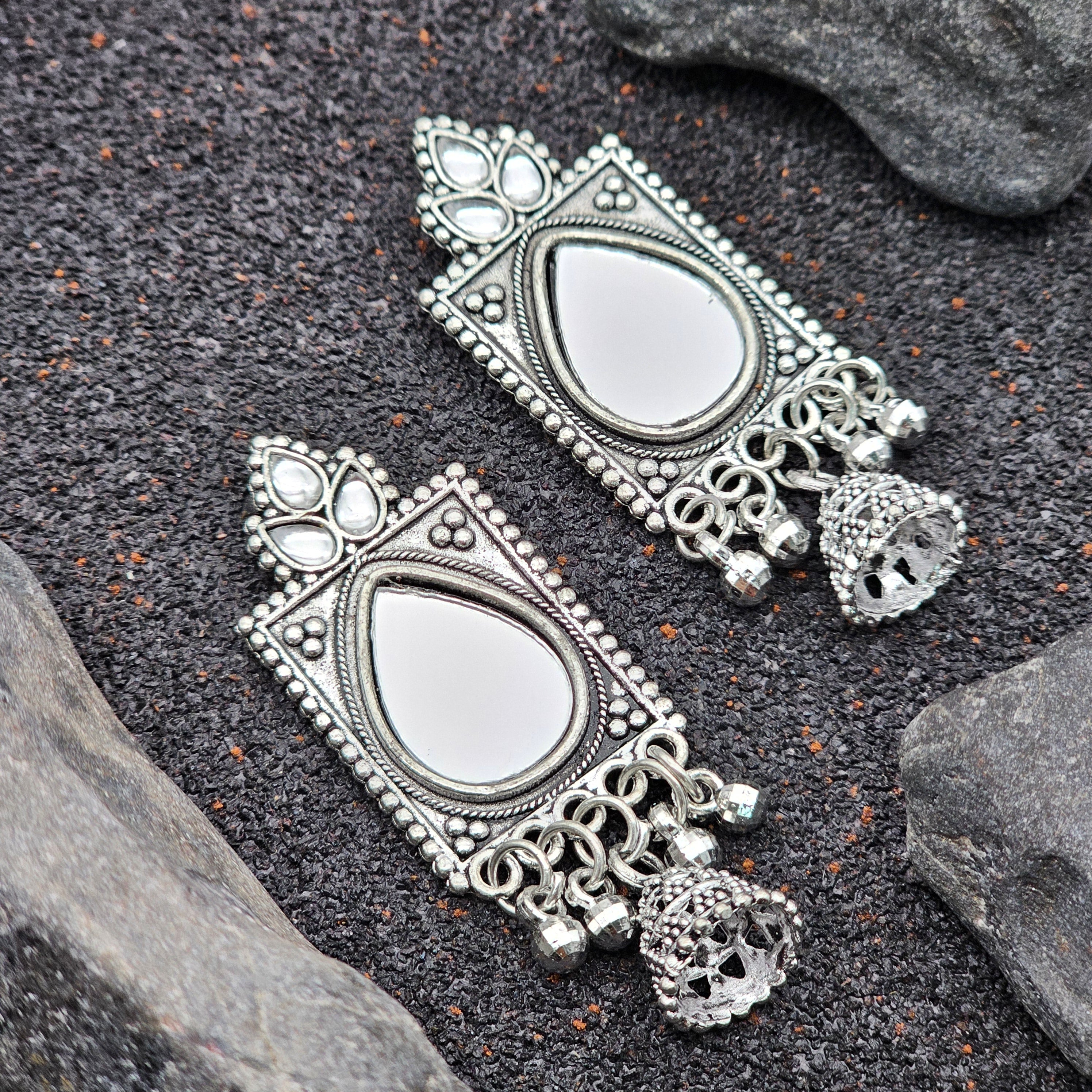 Ethnic Oxidised Silver Mirror Drop Jhumka Earrings