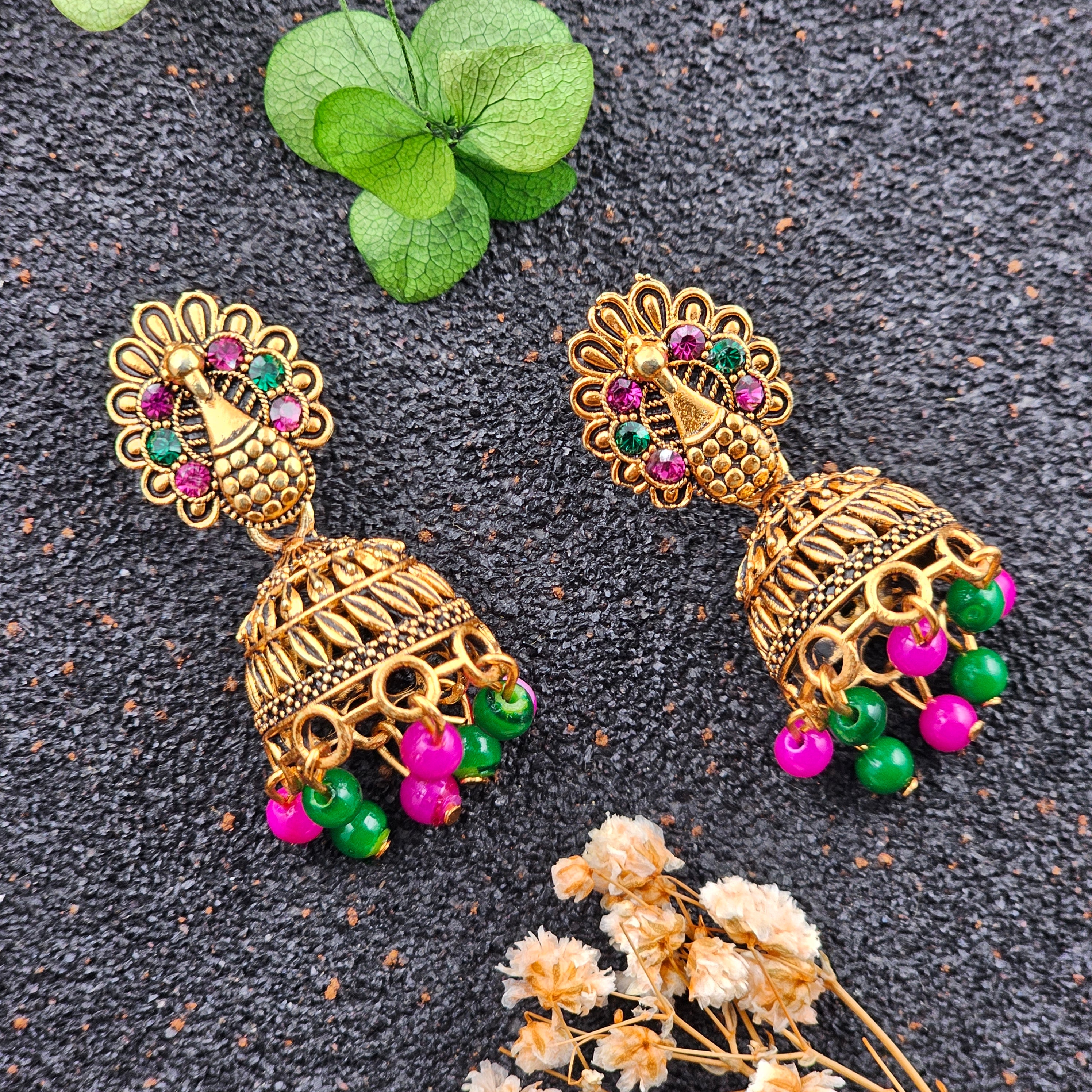 Golden Oxidised Peacock Shape Multicolor Beads & Stone Jhumka Earrings