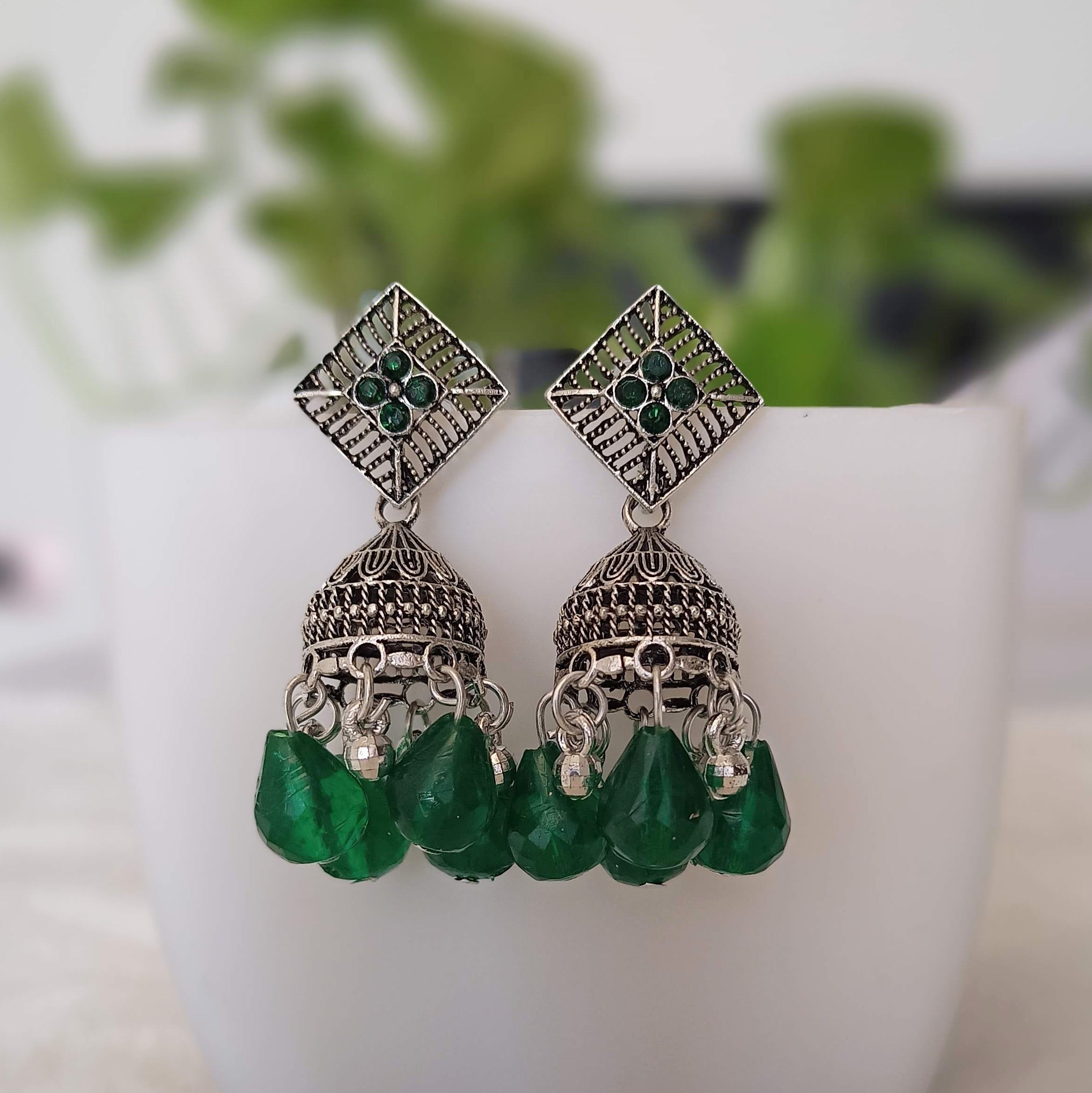 Green Color Big Beds Jhumka Silver Oxidised Earrings