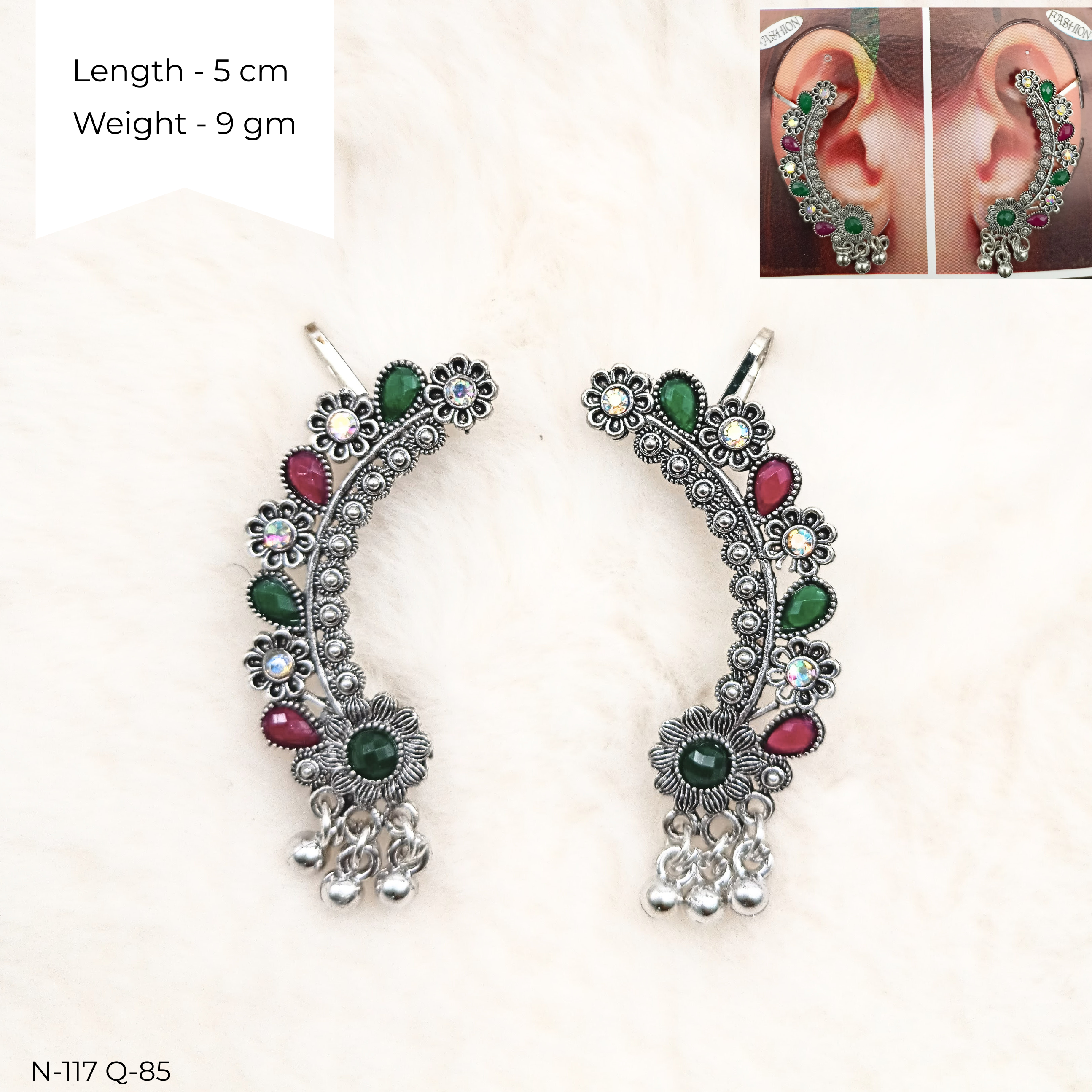 Green & Pink Stone Ear Cuffs Silver Oxidised Festive Season Earrings