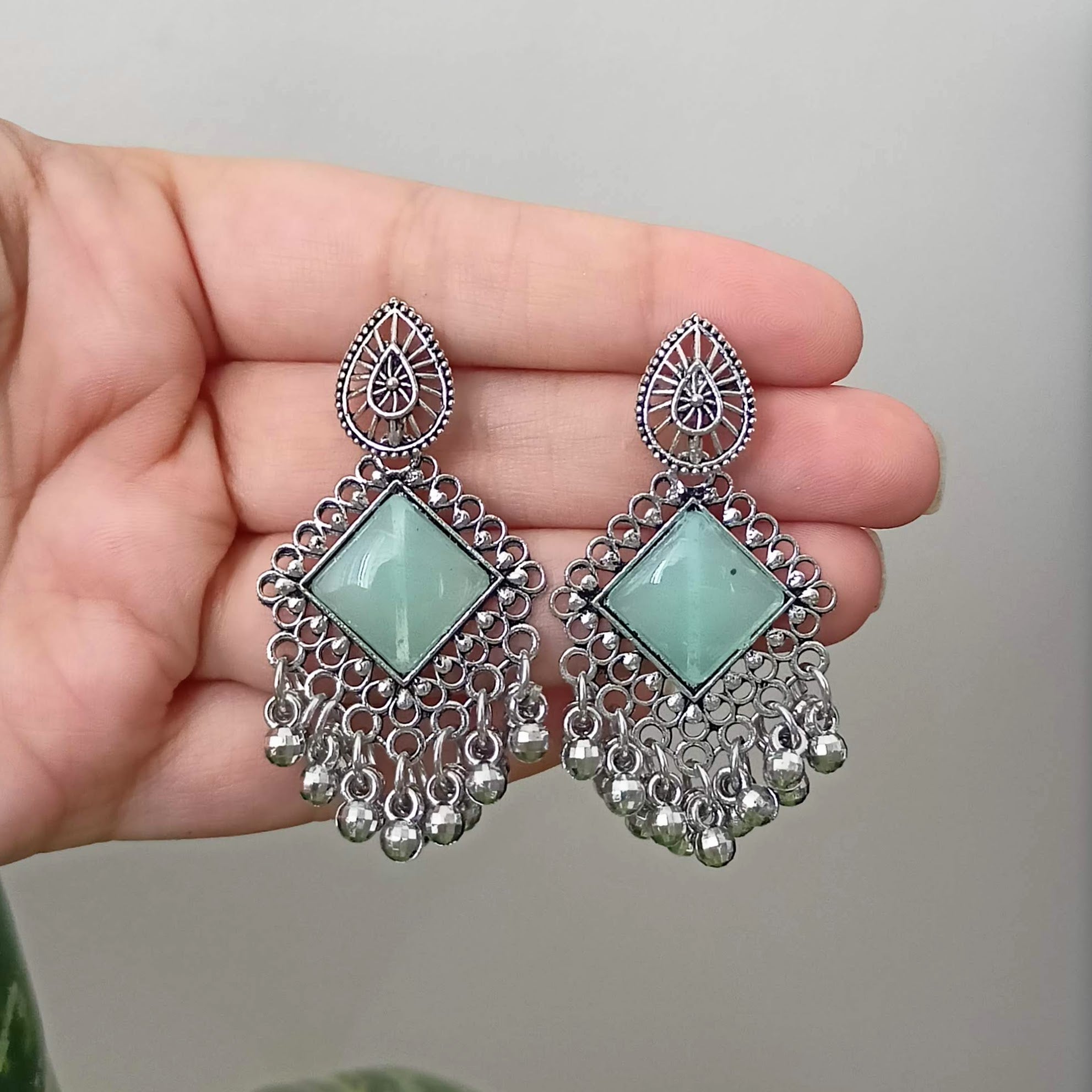 Light Green Stone Sticker Silver Oxidized Trendy Earrings