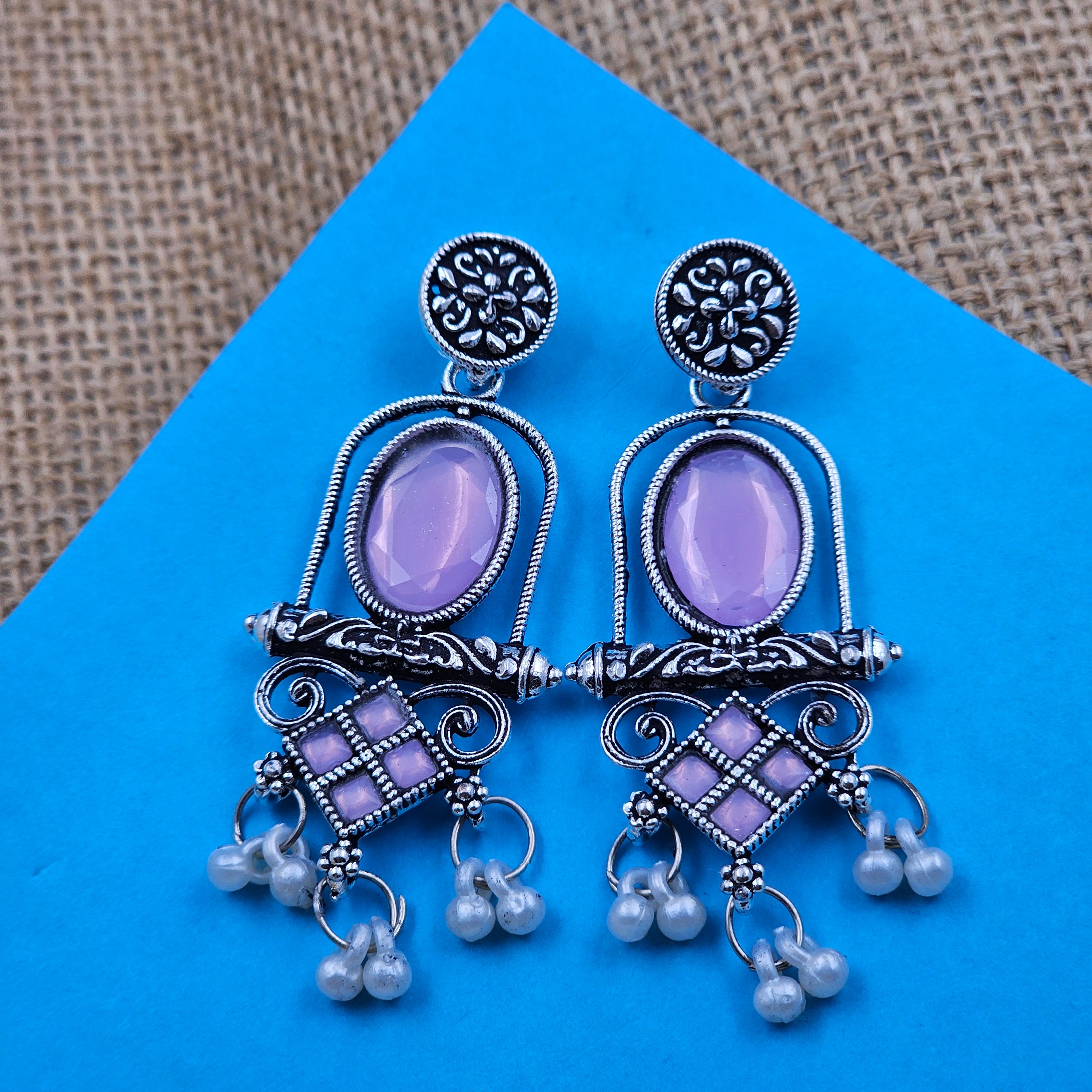Light Purple Oval Shape Stone Studded Silver-Tone Earrings