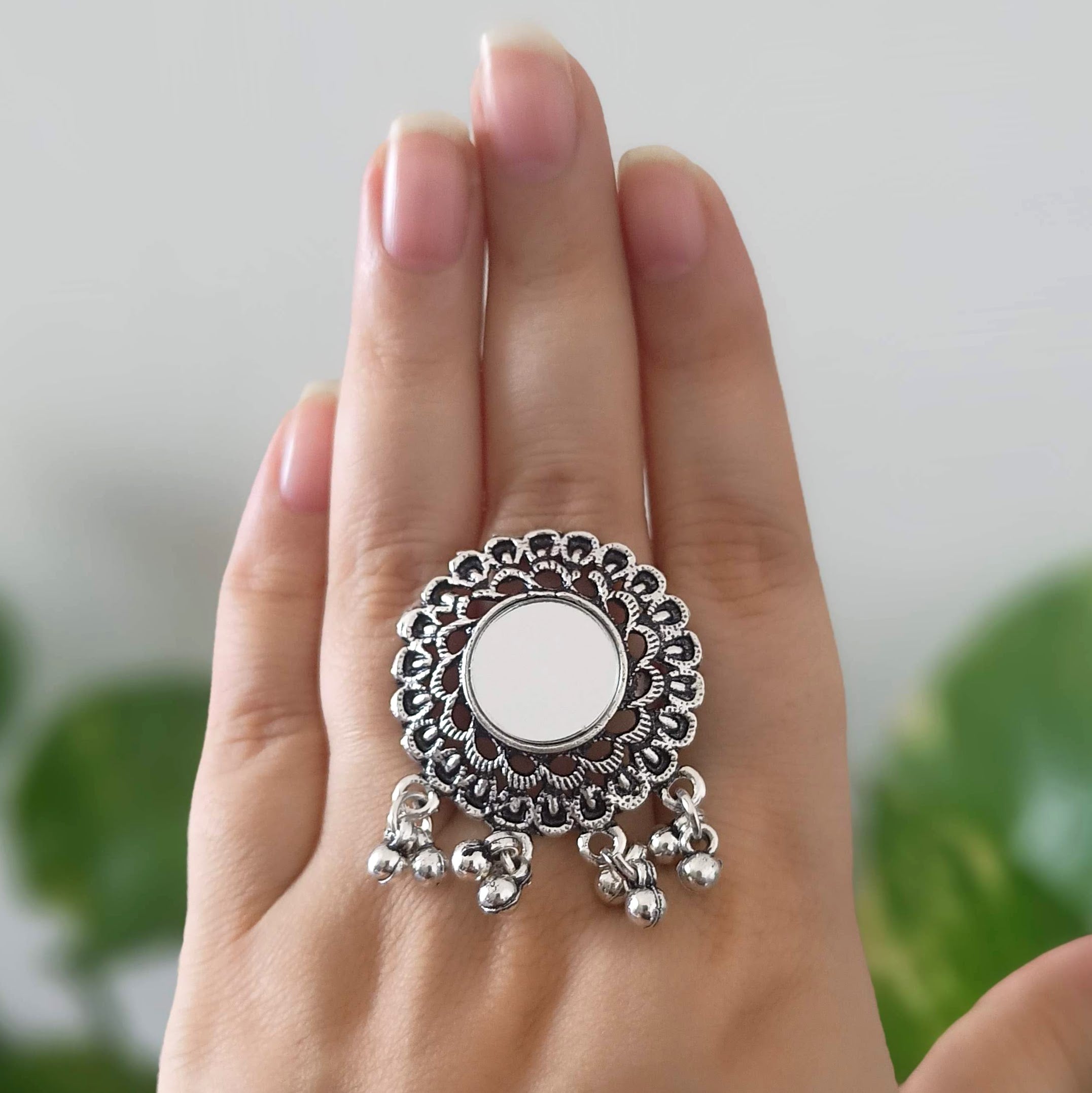 Mirror Round Shape Trendy Silver Oxidised Adjustable Finger Ring