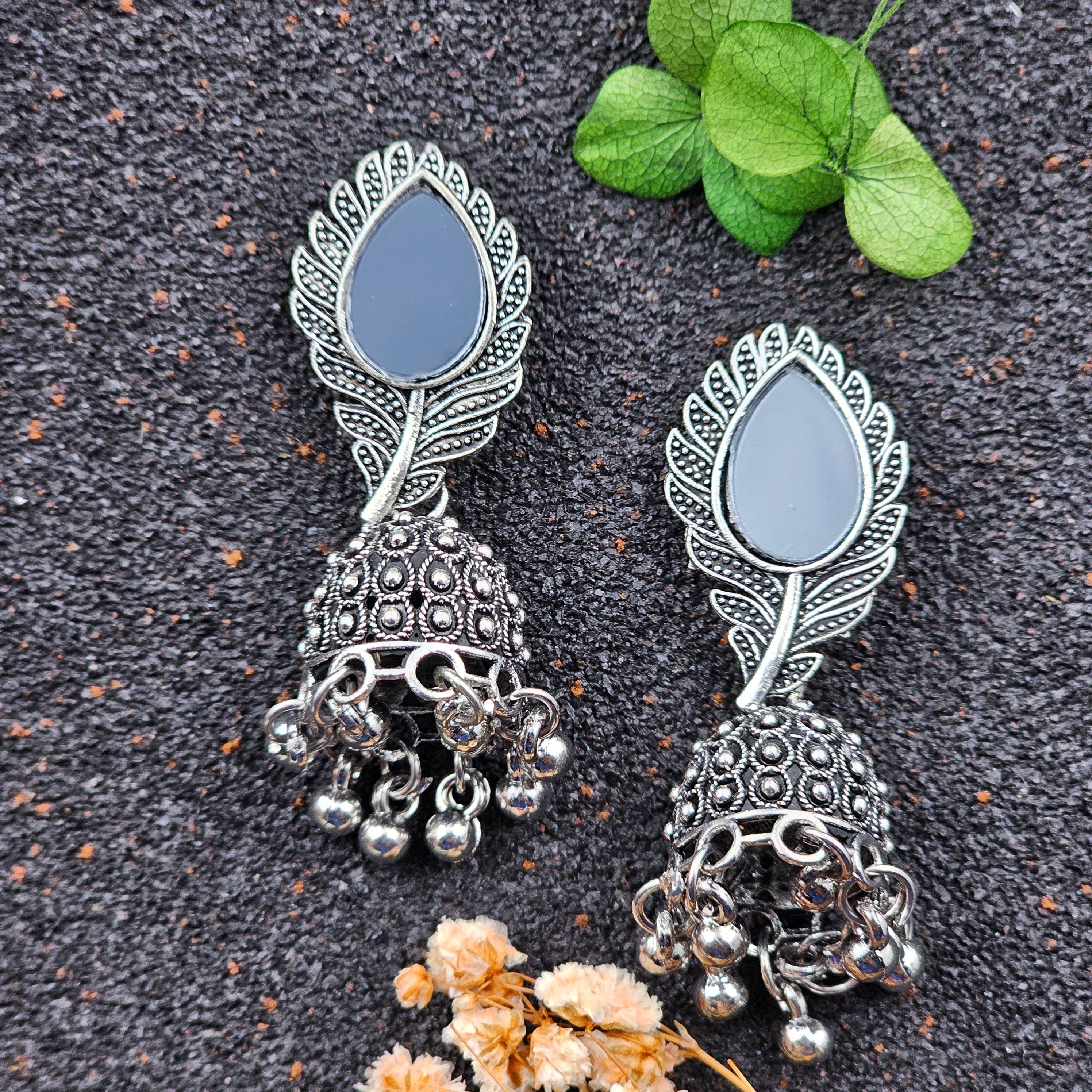 Mirror Tikka Shape Silver Oxidized Peacock Feather Drop Jhumka Earrings