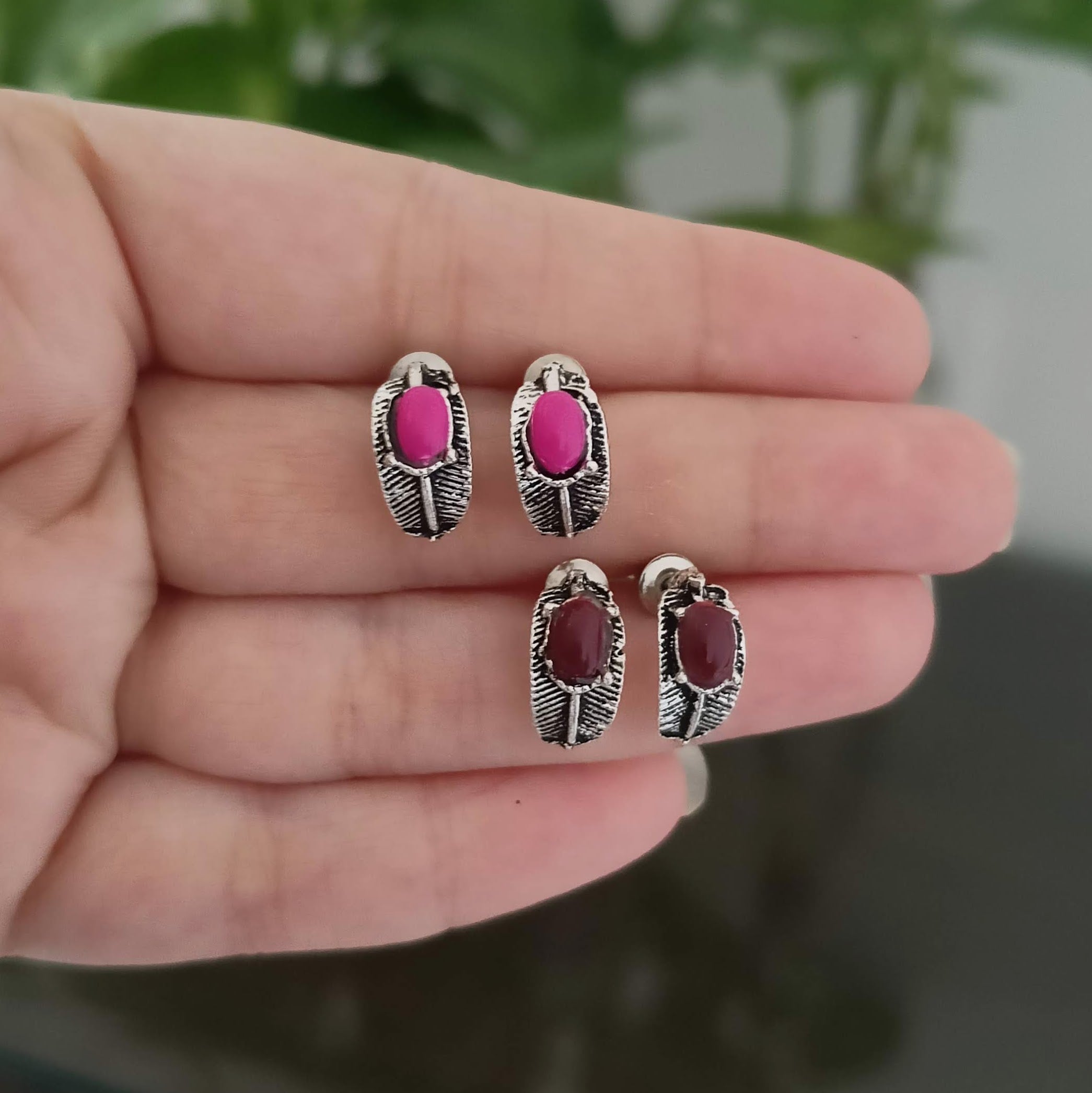 Pink & Dark Red Stone Silver Oxidised Studs Tiny Earrings (Pack of 2)