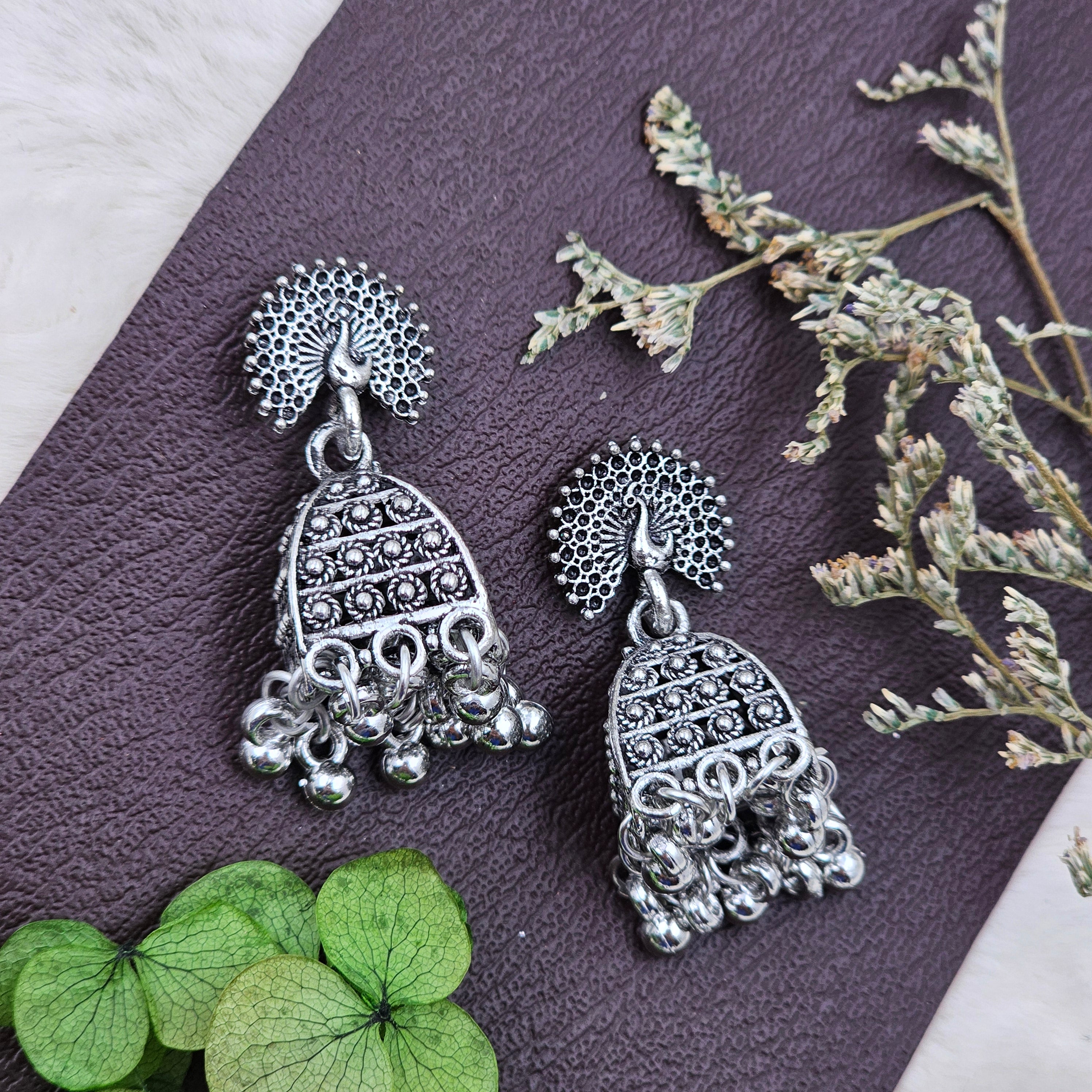 Silver-Toned Oxidised Peacock Dangler Drop Earrings