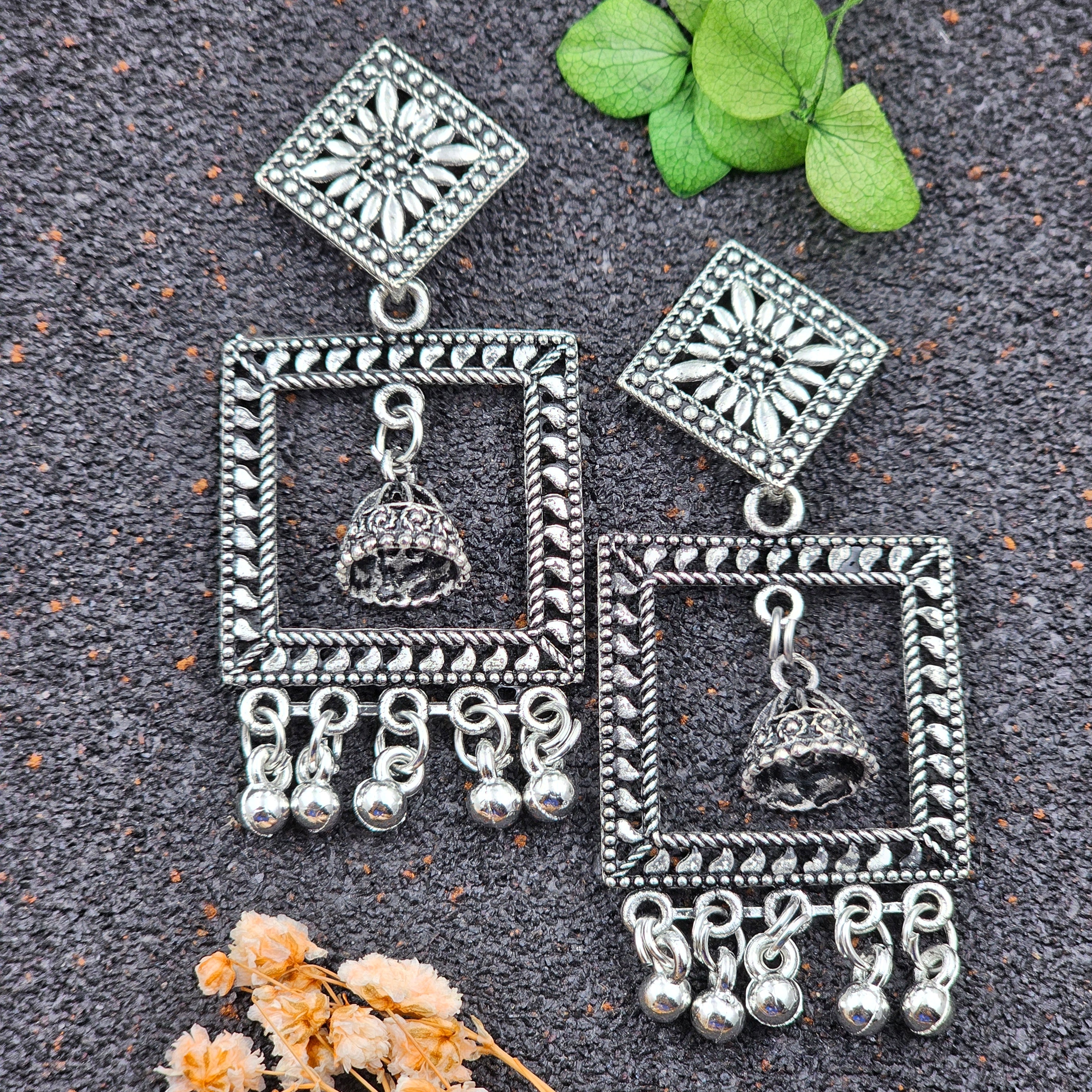 Square Shape Jhumka & Beads Silver Oxidised Beautiful Earrings