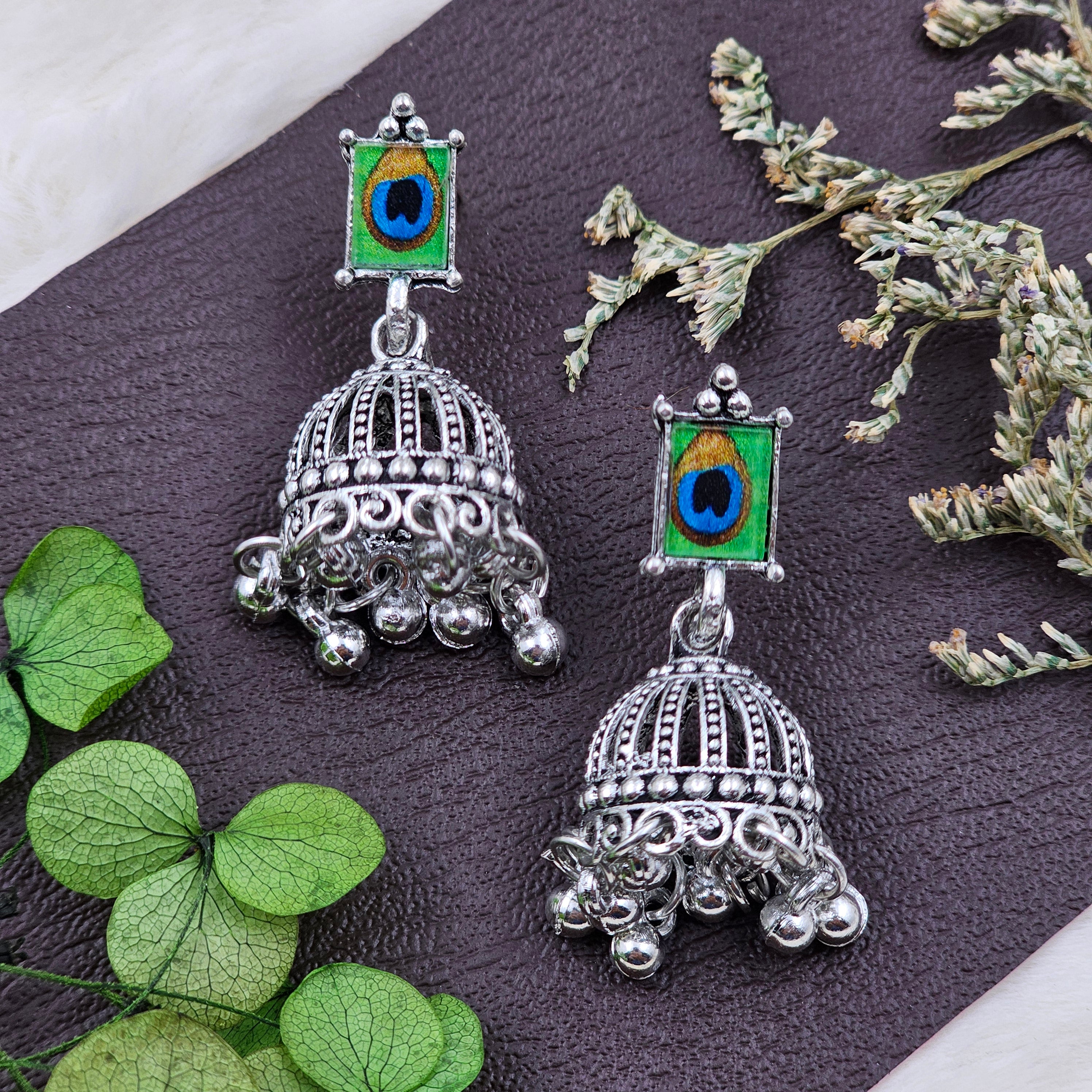 Traditional Peacock Feather Dome Shaped Silver Oxidised Jhumka Earrings