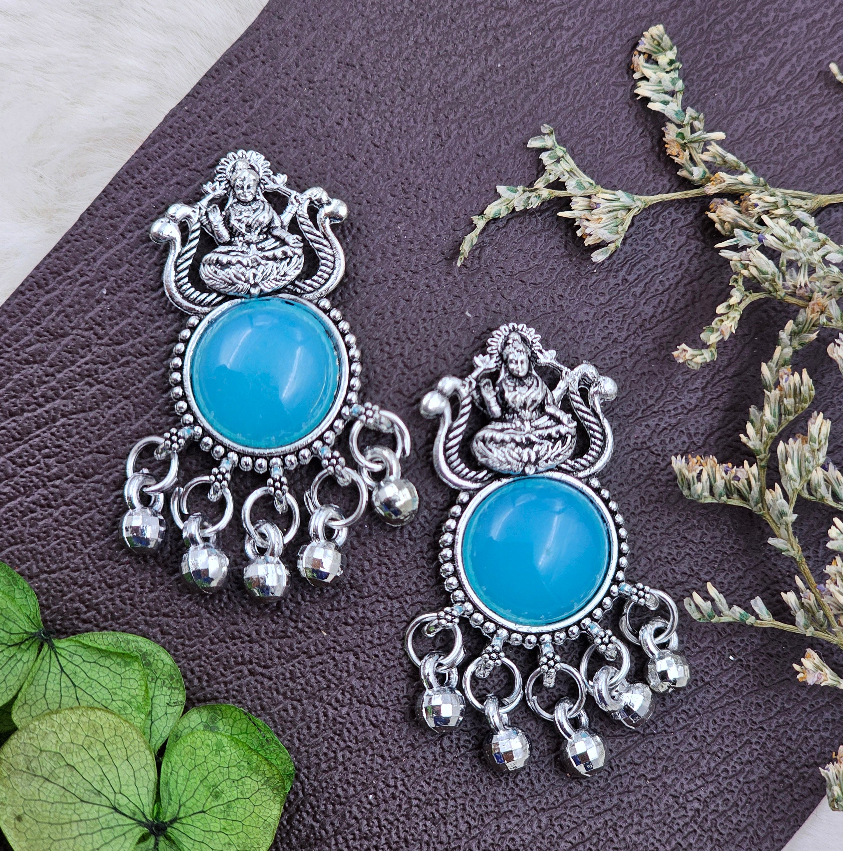 Traditional Silver Oxidised Blue Stone Jhumki Drop Earrings